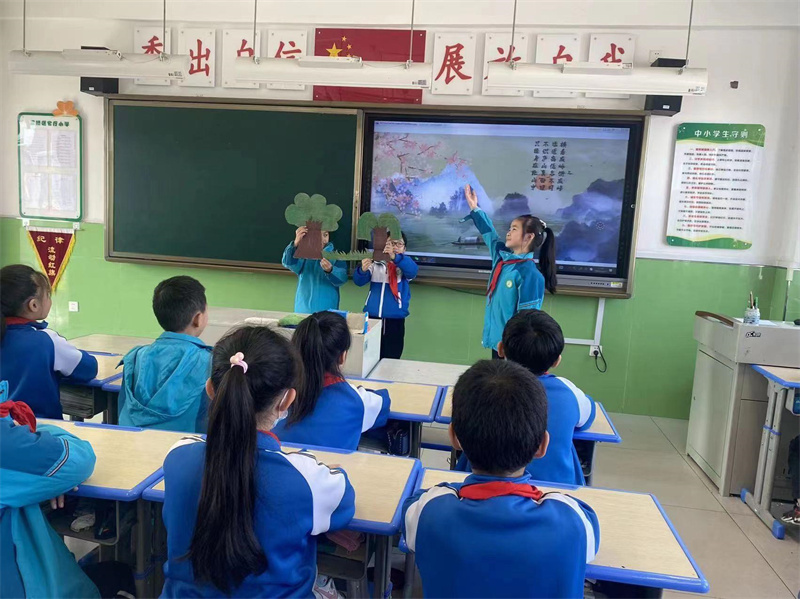 阳光讯(记者 梁永飞 通讯员 董彦军)西安市灞桥区官厅小学语文组的老师安排各班开展诗词诵读会,在诵读中理解诗意,体会诗韵,感悟诗境。在学习古诗《雪梅》等古诗时,采取了手势舞记忆古诗的方式,学生们兴趣浓厚,跟着旋律唱跳,朗朗上口,多感官一起参与感受诗的韵律美。