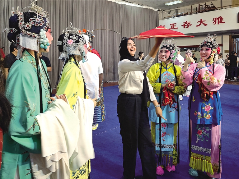 7月19日,来自巴基斯坦的网络博主美月学习戏曲技巧手帕功。记者 李羽佳摄