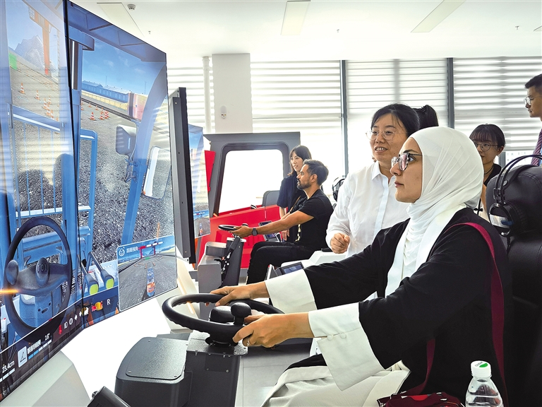 7月18日,西铁教育培训基地,阿塞拜疆网络博主伊拉达·加迪罗娃体验叉车模拟驾驶。 记者 李羽佳摄