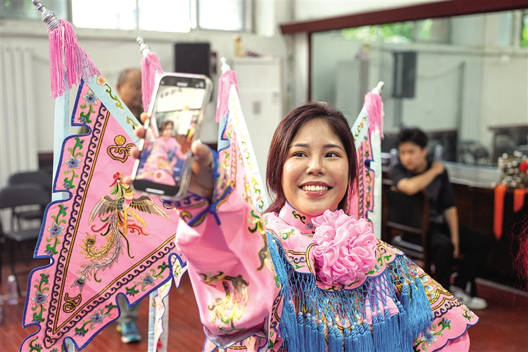 7月19日,陕西省戏曲研究院,穿上秦腔戏服的马来西亚网络博主郭懳恩开心地自拍。