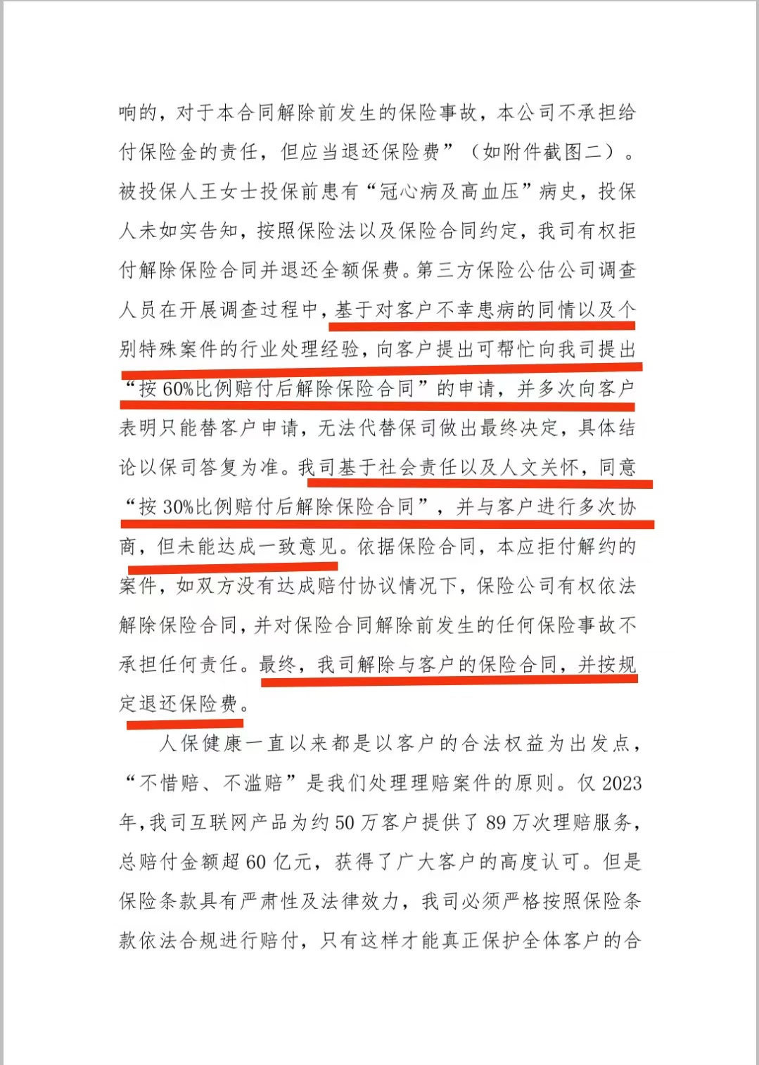 6月6日,人保公司回复《阳光报》记者:根据《中华人民共和国保险法》的相关条例,保险公司应履行询问义务,投保人也应履行相应的如实告知义务。任先生在投保以及续保过程中,均未如实告知被保险人患有不满足承保条件的疾病,且2018年9月至2024年3月期间未向人保公司提交任何理赔申请,故在没有获知被保险人存在违反健康告知的疾病的前提下,人保公司按照客户符合健康告知进行承保及续保。被投保人王女士投保前患有“冠心病及高血压”病史,投保人未如实告知,按照保险法以及保险合同约定,人保公司有权拒付或解除保险合同并退还全额保费。第三方保险公司调查人员在开展调查过程中,基于对客户不幸患病的同情以及个别特殊案件的行业处理经验,向客户提出可帮忙向人保公司提出“按60%比例赔付后解除保险合同”的申请。人保公司基于社会责任以及人文关怀,同意“按30%比例赔付后解除保险合同”,并与客户进行多次协商,但未能达成一致意见。最终,人保公司解除与客户的保险合同,并按规定退还保险费。