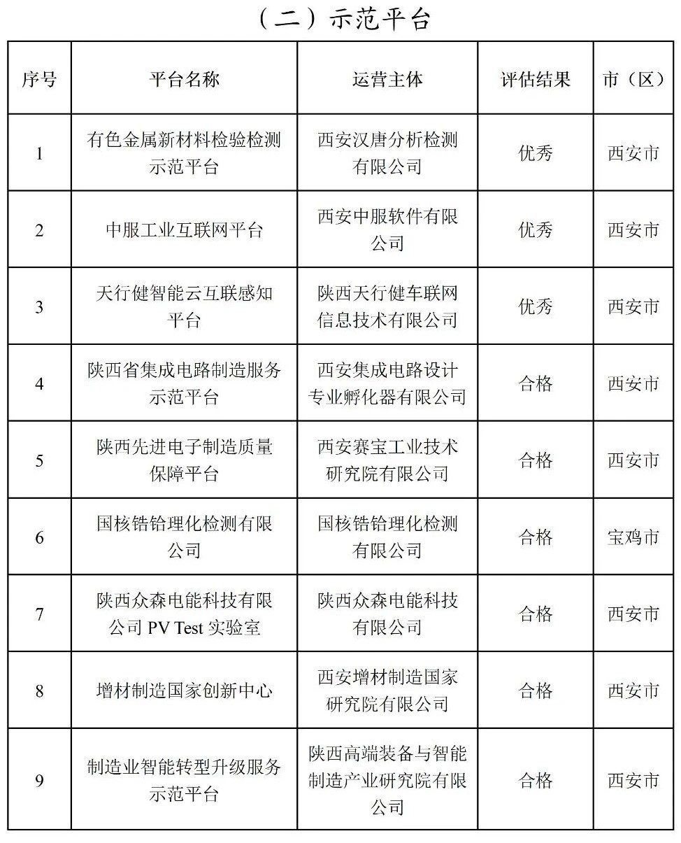 5个省级服务型制造示范平台是大力神新材料锻件定制化服务平台、广电计量一站式计量检测综合服务平台、中国煤科信息公司工业互联网平台、苏试西北综合测试服务平台、陕西省非金属矿产品及制品检验检测认证服务平台。
