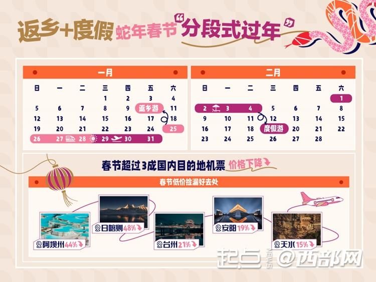 由于春节8天假日加上请假4天最长可连休13天的超长假期,不少人采取“分段式过年法”,即第一段:提前2-3天踏上返乡之旅,回家乡同家人一起看春晚、吃年夜饭欢度除夕;在大年初一、初二开启第二段度假之旅,或国内跨省游或境外短线游。