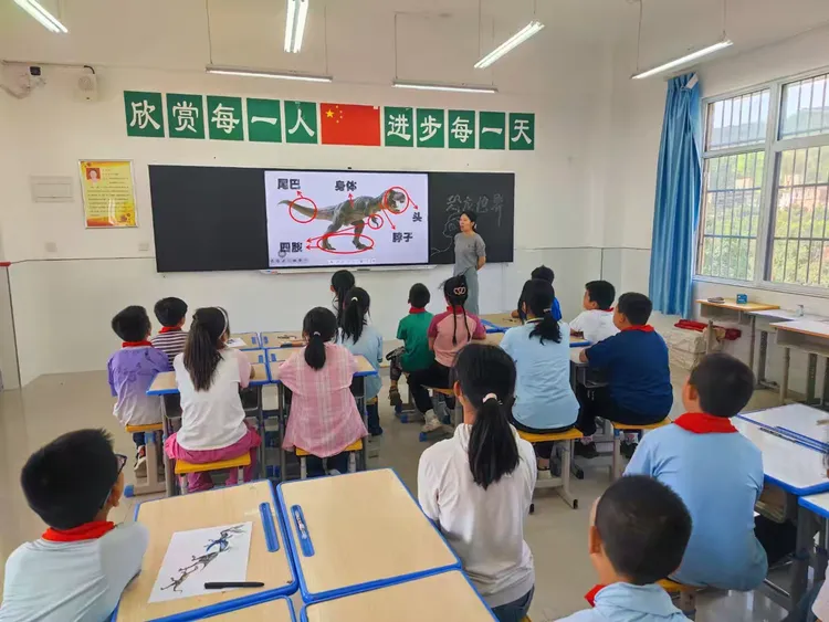此次展示活动涵盖语文与美术、英语与科学等学科融合,实现了深层次的跨学科整合。活动不仅聚焦理论知识传授,更着重实践操作与教学反思。在语文课《飞向蓝天的恐龙》中,吕老师引导学生探究恐龙的演化历程;轩老师的美术课《恐龙世界》则带领学生观察恐龙的身体结构与体型差异,并指导学生完成恐龙绘画创作。通过这两节课,学生直观感受到,同一主题在不同学科中呈现出的知识侧重点与学习视角差异。