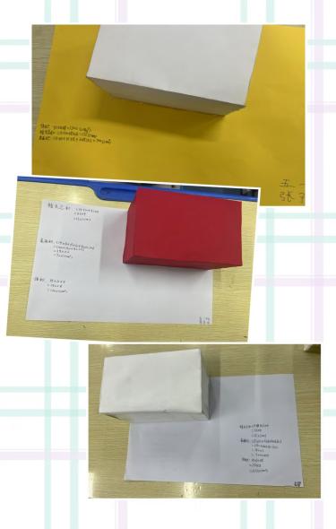 五年级学生通过动手制作长方体或圆柱体,测量所需数据,计算表面积与体积。让学生将课堂知识运用到动手实践过程中,培养了学生的动手操作、动脑思考、数据整理能力,激发了学生参与的积极性,培养了学生学习数学的兴趣,学生的数学素养也得到了提高。