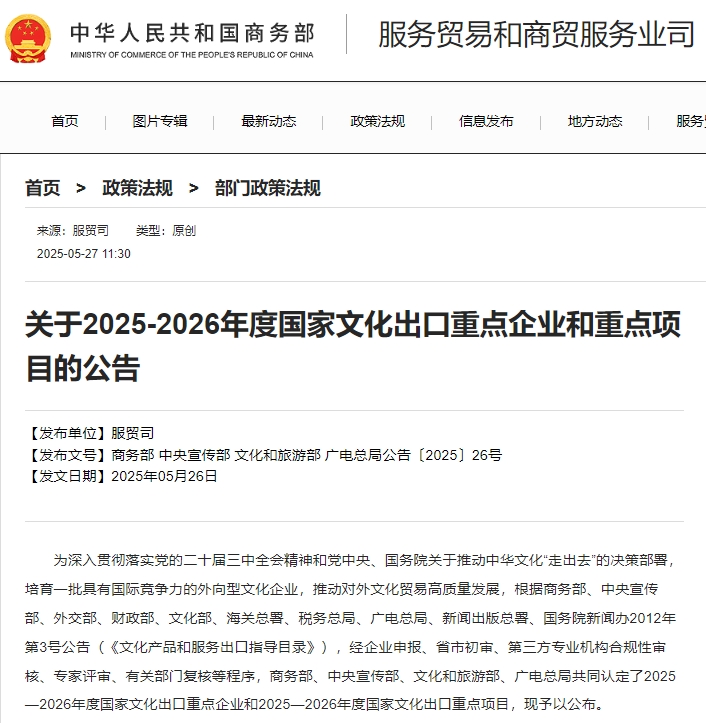 近日,商务部、中央宣传部、文化和旅游部、广电总局共同认定了2025—2026年度国家文化出口重点企业和2025—2026年度国家文化出口重点项目,并予以公布。陕西省三家企业、三个项目入选,这其中,三家企业、两个项目均来自西安高新区,再次彰显了西安高新区在文化出海方面的过硬实力。