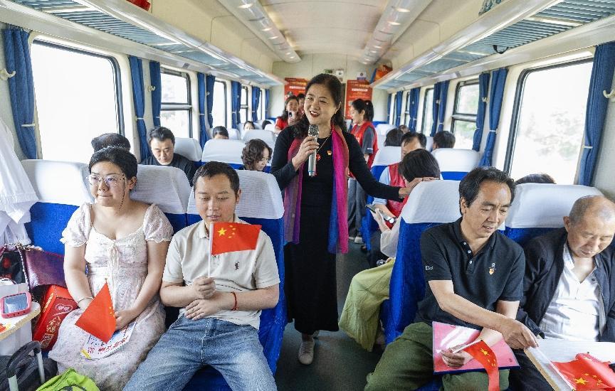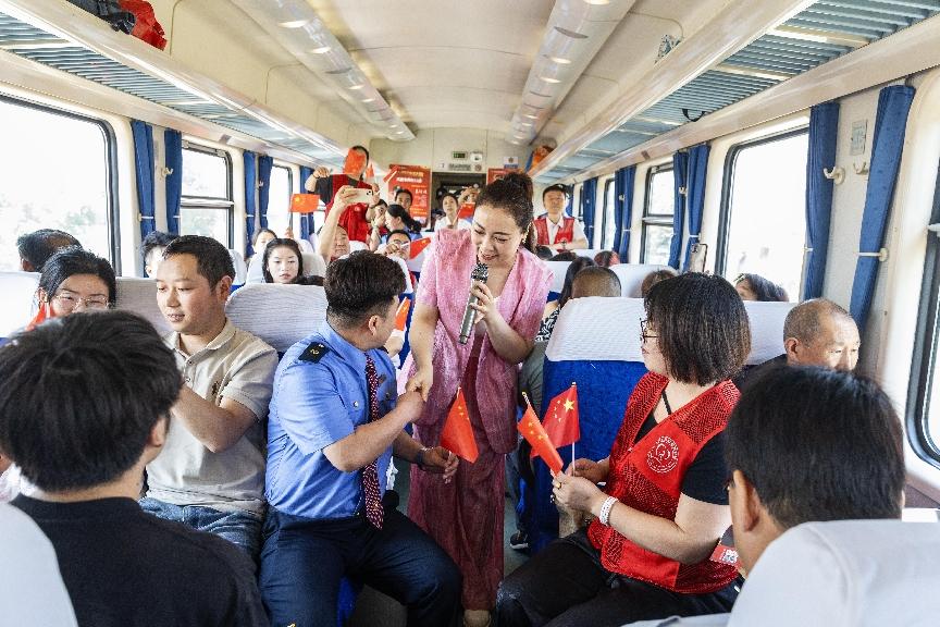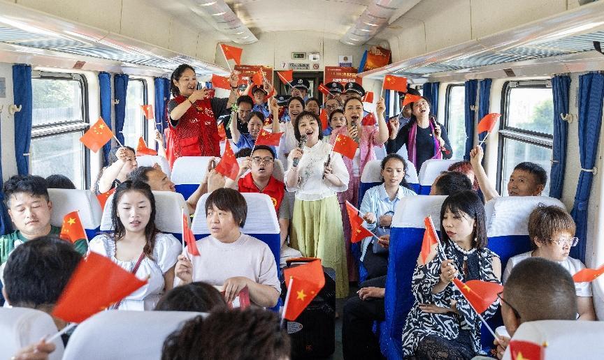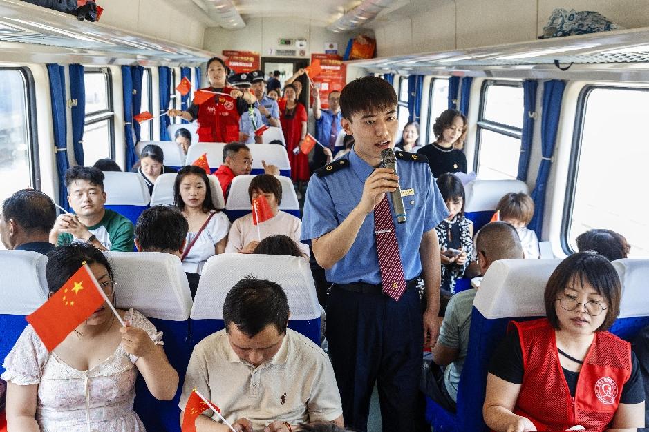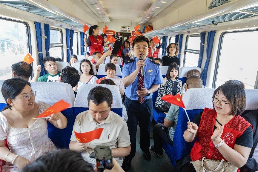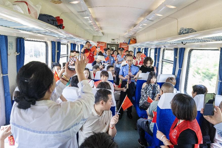 最后,全体人员手举国旗齐声高唱《歌唱祖国》,激昂的旋律在车厢内久久回荡。