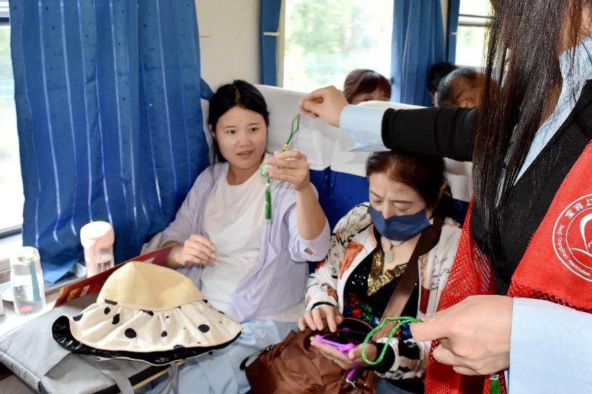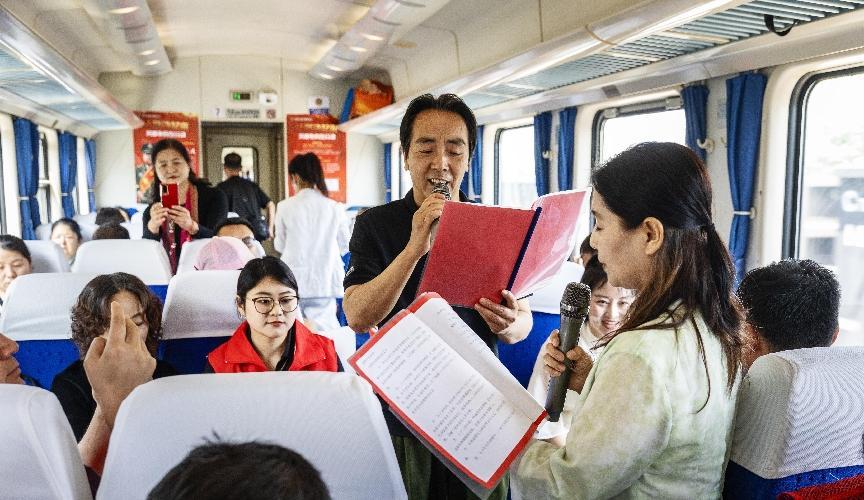 慰问活动以丰富多彩的互动环节串联起传统节日文化与志愿服务精神。宝鸡市图书馆闫瑜带领团队开展“端午”主题读书分享,朗诵《端午情思》、《将进酒》、《我眼中的屈原》等经典篇章,并组织“飞花令”诗词游戏,旅客与乘务人员踊跃参与,车厢内掌声不断。