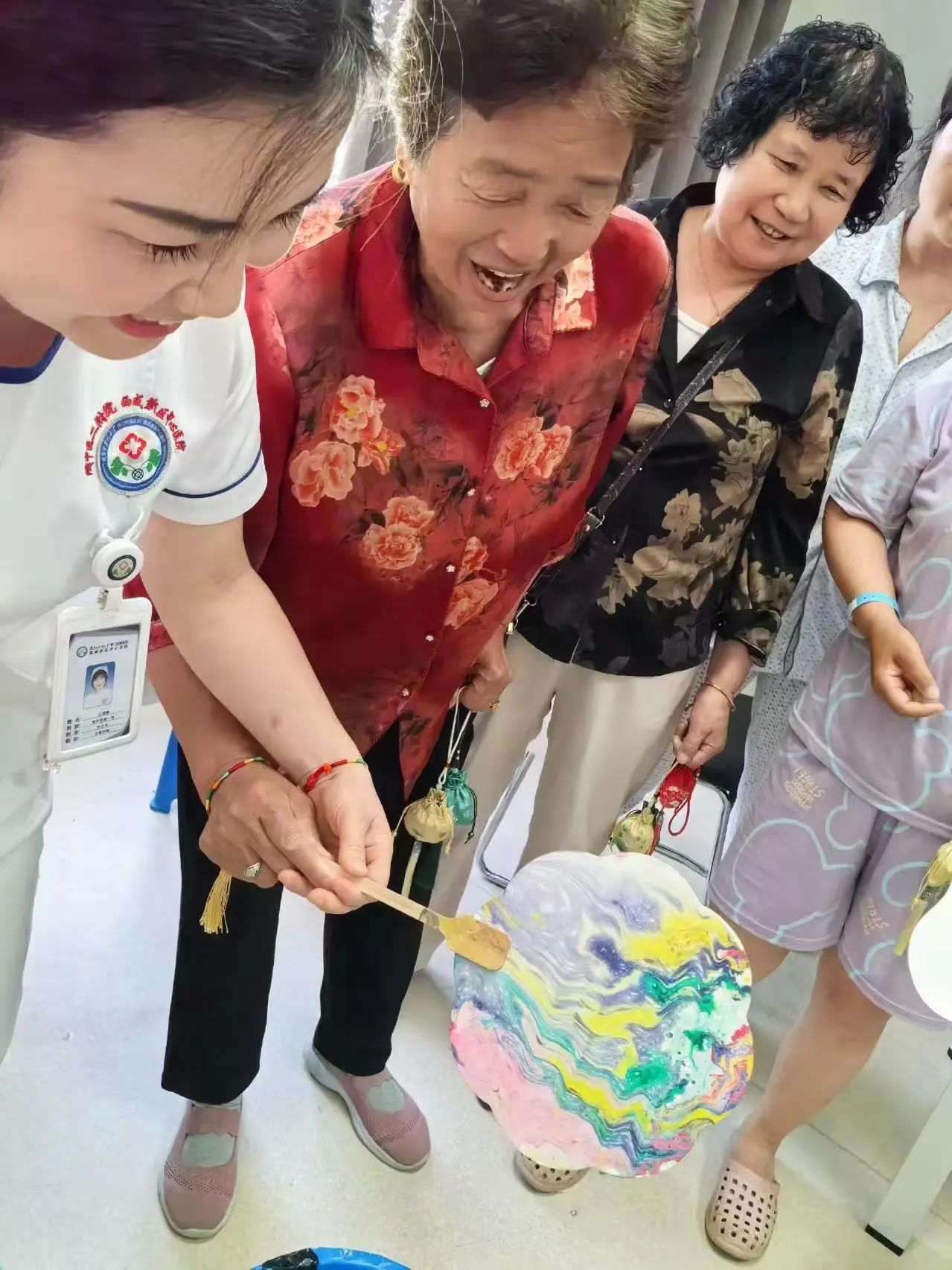 活动中,医护人员准备了素雅的空白团扇和五彩颜料,患者们纷纷化身“艺术家”,蘸取颜料滴入清水中,以独特的“漆扇”技法勾勒出斑斓纹路。扇面如水墨晕染,或似繁花绽放,每一把扇子都承载着个性化的创意。“平时治疗紧张,没想到在医院还能静下心来画画,感觉心情放松多了!”一位患者举着亲手制作的漆扇欣喜地说道。