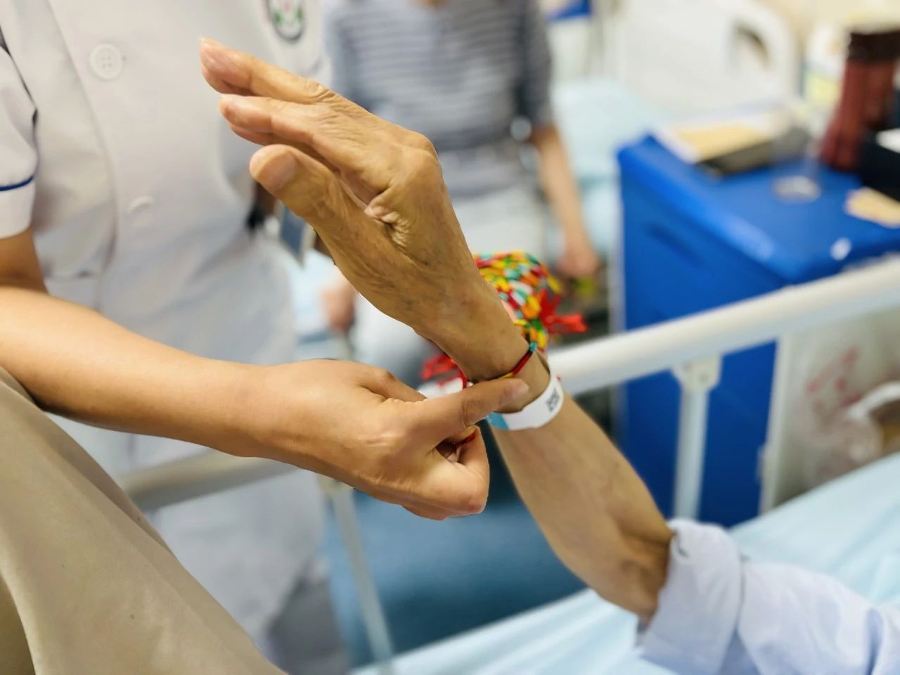 在“戴手绳”和“绘漆扇”区域,患者与家属同样热情高涨。护士们提前准备了已经制作好的手绳,寓意驱邪纳吉。科主任魏志力为患者戴上手绳并祝福道:“希望您早日康复,戴着它讨个平安彩头。”