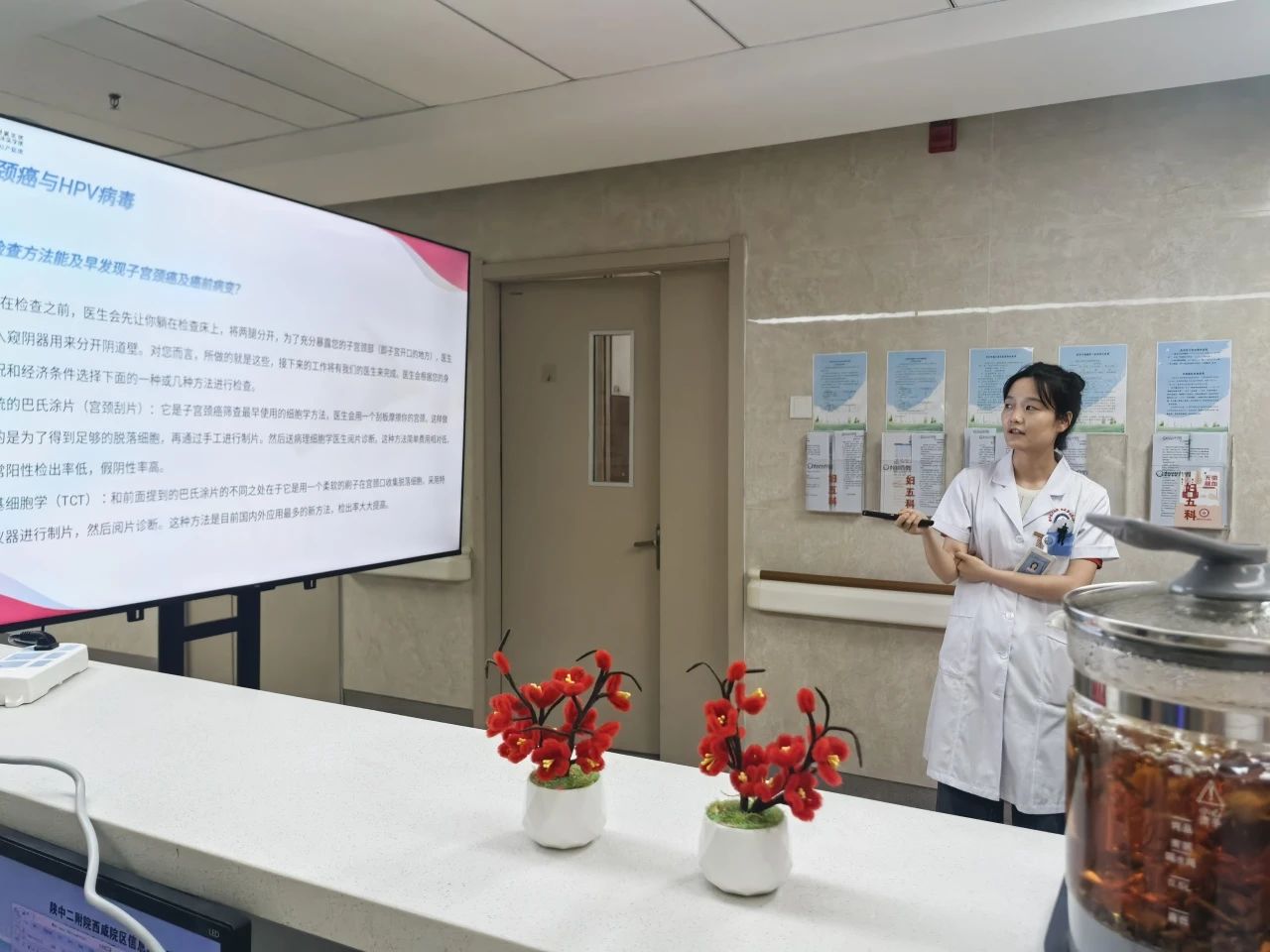 活动伊始,护士长边映维从科室医护团队、诊疗范围、开展新技术、中医特色疗法、病区环境等向患者朋友做详细的介绍。健康讲堂环节,主治医师许迪以"预防宫颈癌,为生命加一道防护"为题展开科普,系统讲解了HPV感染途径、三级预防策略及疫苗接种重要性,针对患者关注的“筛查年龄”“癌前病变治疗”等问题进行详细解答。“早期宫颈癌治愈率超90%,定期筛查就是最好的‘护身符’。”