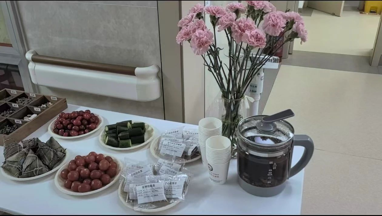 护士长王妮娜带领护理团队为患者递上精心熬制的益气补血养颜茶、养阴润肺茶,并讲解夏季肝胆养护的饮食小知识。患者李阿姨捧着茶盏感慨:“没想到在医院也能过端午节、吃粽子、做香囊!”