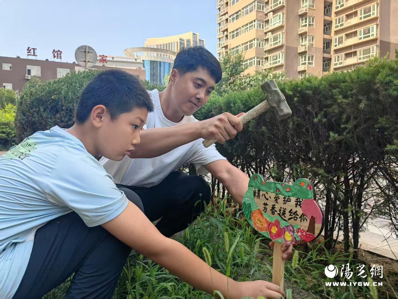 在府谷县阳光社区的绿化带和广场上,“精心爱护我 芳香送给你”的提示牌在孩子和家长“叮叮当当”的敲打声中,插在了草坪上。这个“不起眼”的爱绿护绿倡议,源自该社区“谷多多”儿童议事会“共育行动家”行动。