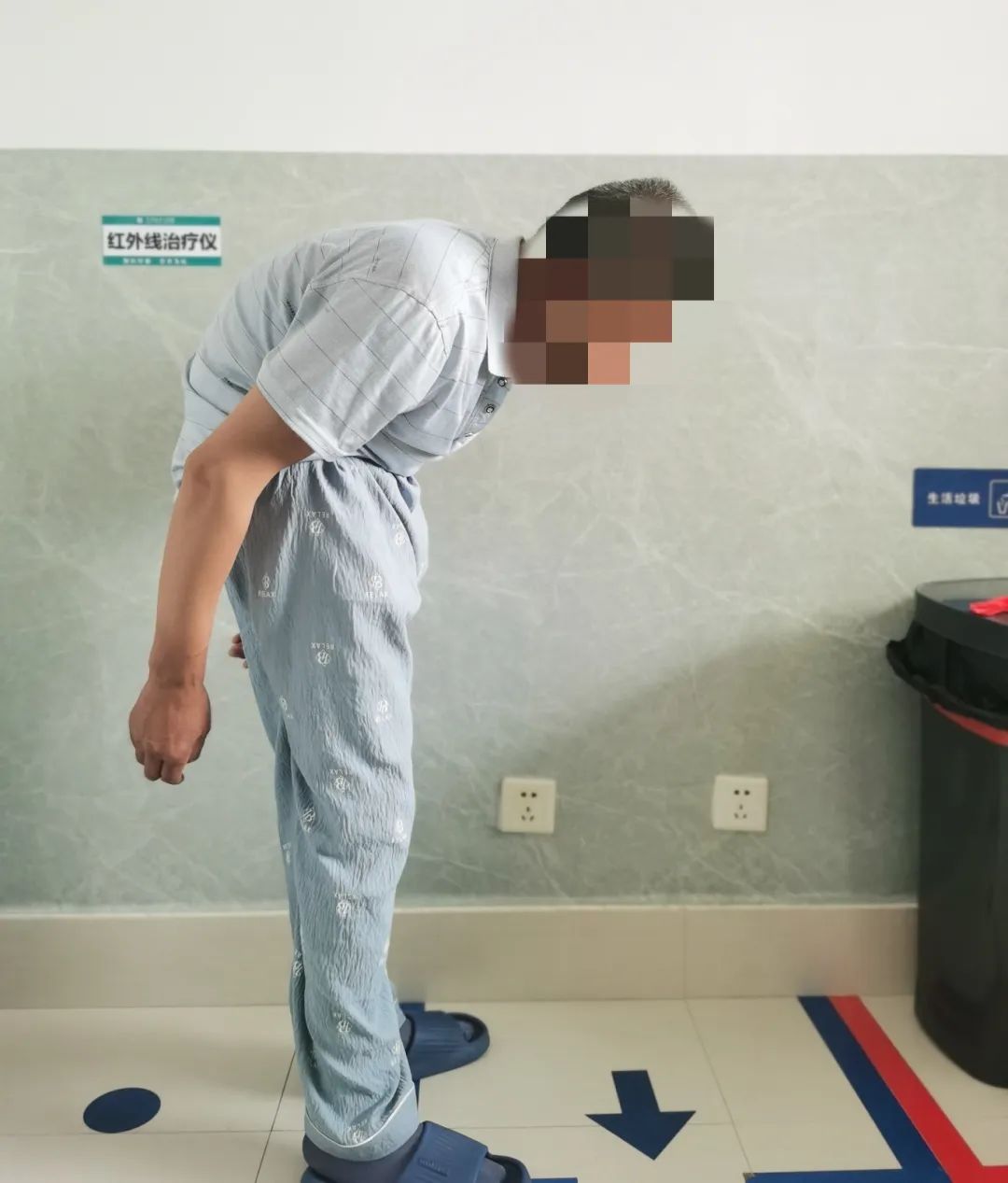 患者为陇县一名53岁的男性,15岁时不幸患上强直性脊柱炎,受其影响脊柱后凸进行性加重,最终形成“折叠人”样畸形。因患病导致形体改变,近40年来患者备受身心折磨,身体上无法平躺,无法平视,行走困难。心理上极度自卑,不愿与人交流,像家庭聚会、拍照这些能躲多远是多远。近半年来,气短严重,活动受限。当地医院推荐他找宝鸡市中心医院脊柱外科王新虎主任,寻求治疗方法。