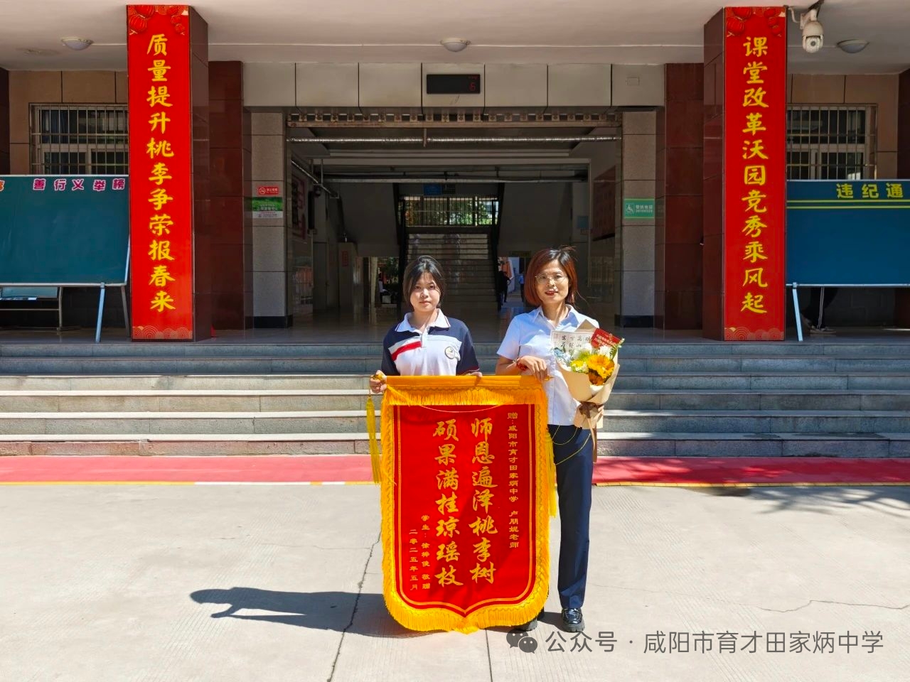 六月蝉鸣起,骊歌正悠扬。在 2025 届高三学生即将告别母校之际,毕业生家长及学生手捧两面锦旗,一面绣有“严爱相济助学子逐梦 、朝夕相伴护青春扬帆”,另一面“师恩遍泽桃李树、硕果满挂琼瑶枝”的鲜红锦旗,郑重地送到班主任老师卢朋妮的手中。学生们鞠躬致谢,现场氛围温馨感人。