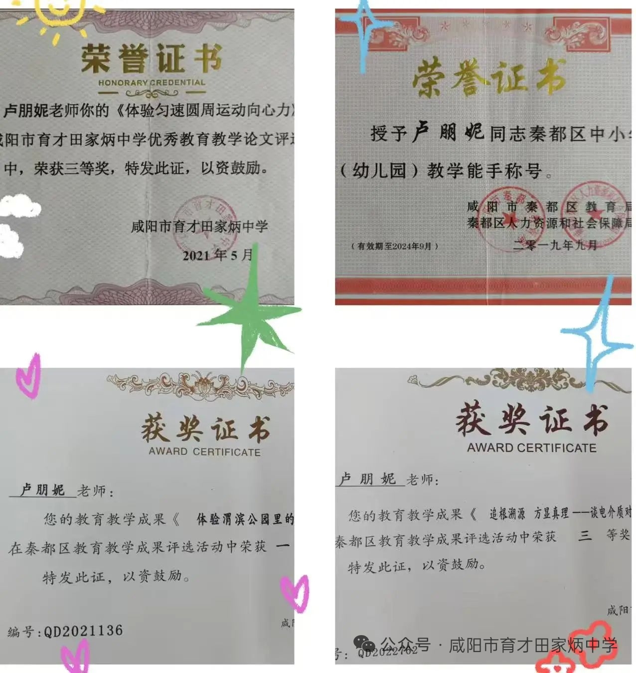 在教研领域,卢朋妮同样成绩斐然。她先后获得多项荣誉:2016 年、2019 年两次被评为 “秦都区高考工作先进个人”;2015 年微课《螺旋测微器的使用》荣获秦都区三等奖;论文《体验匀速圆周运动所需的向心力》《牛顿第一定律》分获咸阳市教育科技之春教研论文二等奖与文本类三等奖;2019 年获评 “秦都区教学能手”;2021 年论文《体验渭滨公园的圆周运动》获区级一等奖,2022 年《谈电介质对电容器电场的影响》获区级三等奖。此外,她还多次在校级 “新秀杯” 赛教中斩获一等奖,屡获校级 “优秀教师”“优秀共产党员” 称号。