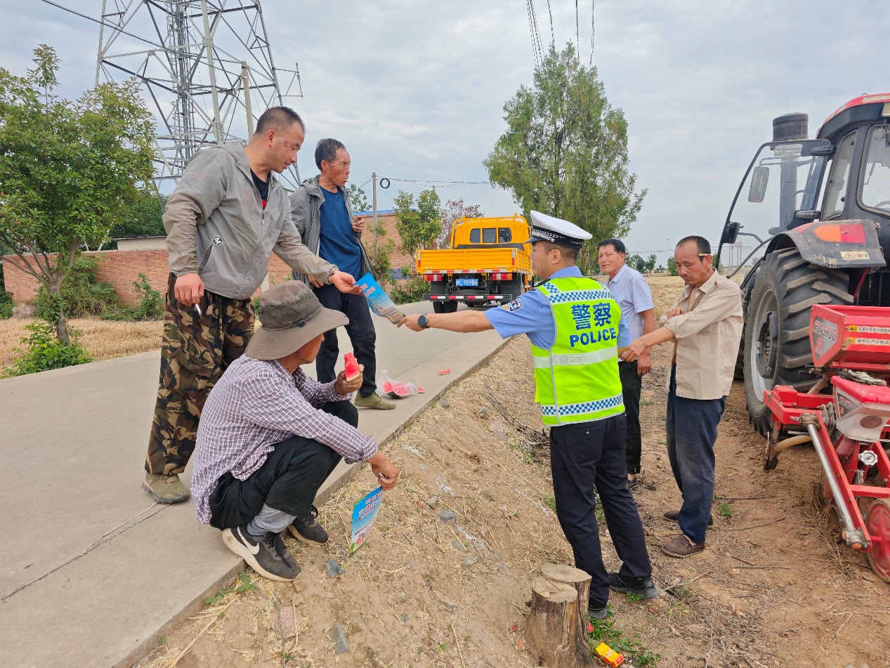 阳光讯(记者 芮扬)金色麦浪翻滚,又是一年丰收时。为筑牢农忙时节道路交通安全防线,6月9日,凤翔交警大队组织警力深入田间地头,将交通安全课堂搬进麦收一线,为群众送上“平安守护礼”。