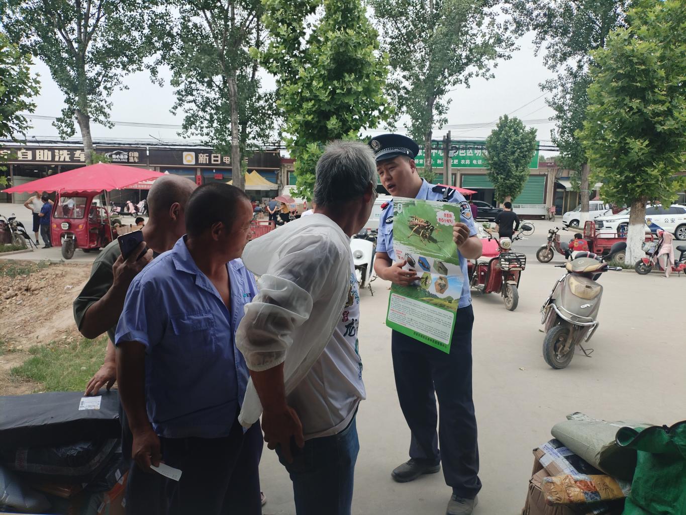 在信息登记工作间隙,民警和联防队员还不忘向村民们传授预防胡蜂伤人的知识。他们提醒村民,夏季是胡蜂活跃的高峰期,尽量不要惊扰胡蜂,外出最好戴上帽子;庭院要定期修剪树木、翻松土壤,减少胡蜂筑巢的可能;不要在村庄附近养蜜蜂,也不要在室外摆放没有掩盖的糖类食物及饮品,防止吸引胡蜂。倘若不幸被蜂群攻击,应尽快用衣物包裹暴露部位,蹲伏不动,千万不要迅速奔跑或反复扑打。