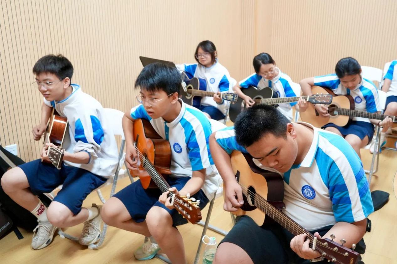 时光吉他社——将流行与民谣巧妙融合,《晴天》《成都》的弹唱清新动人,而《海阔天空》中电吉他与木吉他的即兴对话,更彰显了学生的创造力与专业素养。