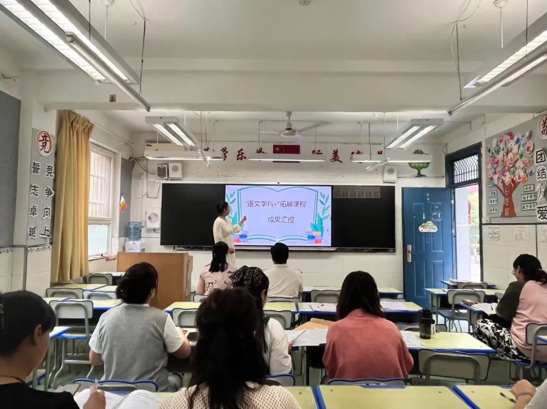 高语组组长陈亮老师的汇报以“‘研’途一路花开,众行定将致远”为主题,陈亮老师介绍团队协作模式:每周微教研直击课堂难题,双周大教研共研教学智慧。分享了马欢老师“跟着诗词去旅行”、胡楠老师“朗诵融入课堂”等优秀“学科+”课程,强调跨学科实践与社团融合让语文学习更鲜活。