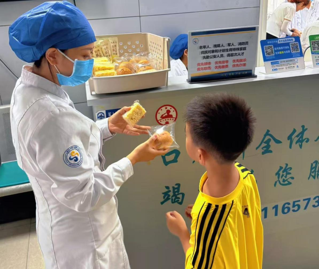 “妈妈,我肚子好饿……” 不久前,一名 6 岁左右的小朋友在妈妈陪同下到口腔科看牙,因一早匆忙赶路未吃早餐,候诊时忍不住向妈妈撒娇。细心的导诊护士听到后,立即从 “暖心零食角” 的筐中取出沙琪玛和面包递给孩子。
