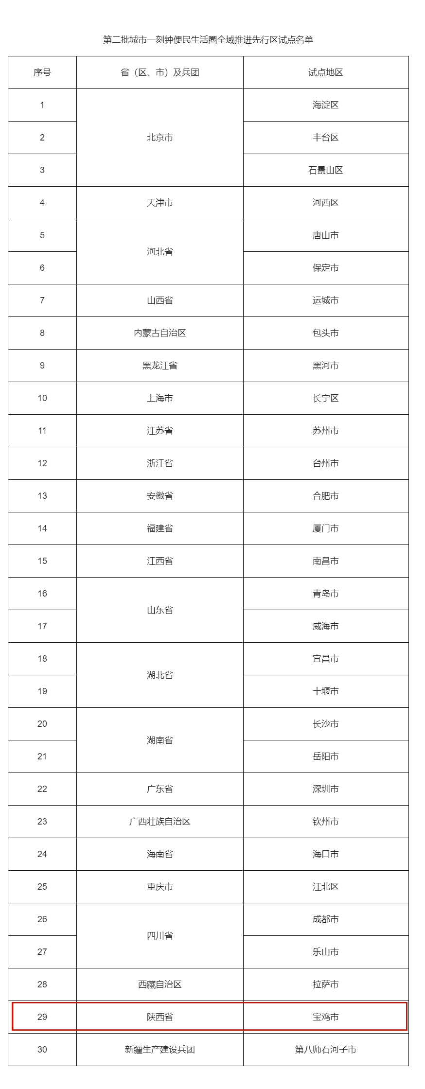 记者从商务部获悉:为全面推动城市一刻钟便民生活圈建设,着力惠民生、促消费,在各地申报的基础上,经专家评审并向社会公示,商务部等部门确定了第二批城市一刻钟便民生活圈全域推进先行区试点地区30个,包括北京市海淀区、丰台区、石景山区,内蒙古自治区包头市,上海市长宁区,安徽省合肥市,陕西省宝鸡市等。
