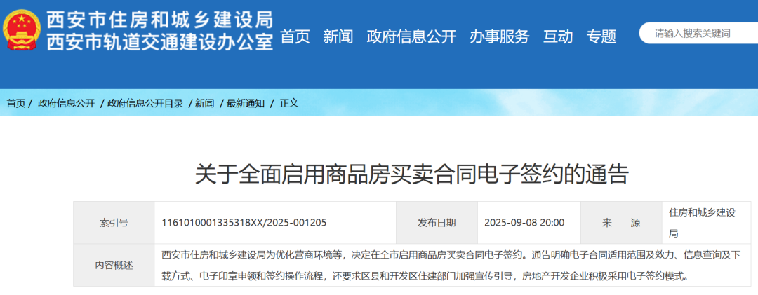 为进一步优化营商环境,深化拓展"三个年"活动,提升商品房买卖合同网签备案服务效能,西安市住房和城乡建设局于9月5日发布通告,决定在全市范围内全面启用商品房买卖合同电子签约。该举措自通告发布之日起正式实施。