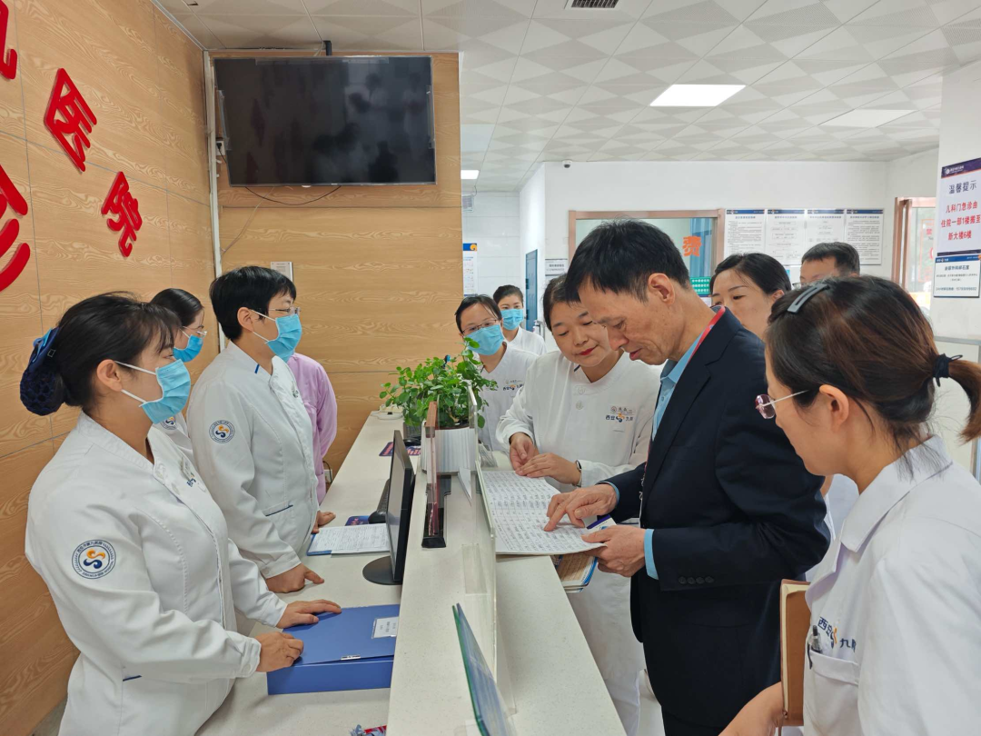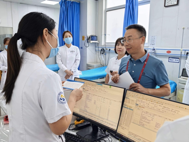 核查专家、渭南市中心医院李军农教授和胸痛中心办公室姬娜主任现场检查急诊科、心内科病房以及医院环境等情况。