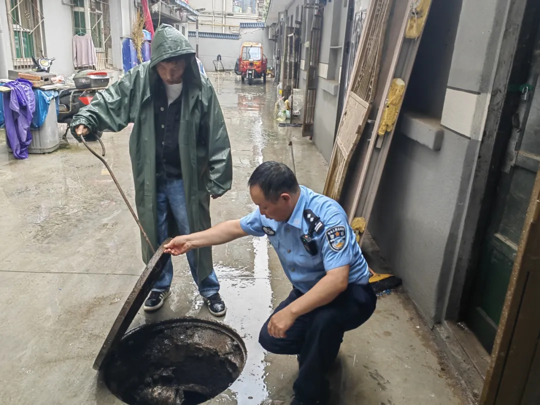 纺织城派出所社区民警徐林辉在暴雨中深入向阳坊小区排查内涝隐患。该小区排水设施老旧,易发生积水。徐林辉冒雨巡查时发现一下水道口被杂物堵塞,积水持续上涨,他毫不犹豫徒手清理淤泥和落叶,历时半小时终于疏通管道,迅速排除险情。周围居民深受感动,连连称赞民警的辛勤付出。