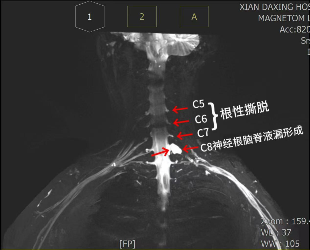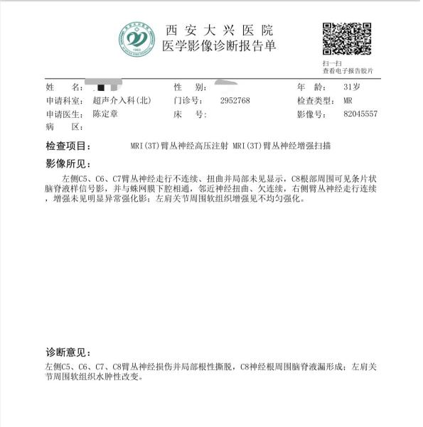 几天后,磁共振报告出来了 —— 结果与陈教授的超声诊断高度一致:颈 5、颈 6、颈 7 神经根根性撕脱损伤,颈 8 神经根脑脊液漏,左颈部可疑创伤性神经瘤形成。
