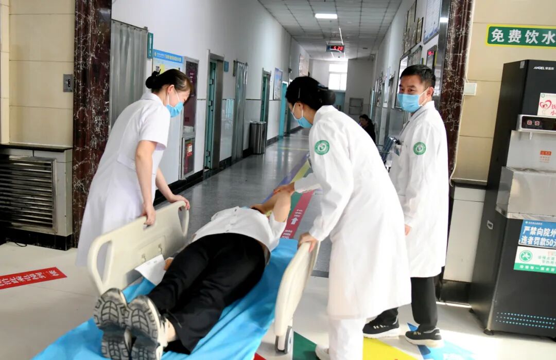 本次演练模拟一名醉酒患者前往急诊科医办室就诊,在护士护送其前往CT检查途中,该患者突然情绪失控,从平车跳下并持凳子砸伤护士头部。