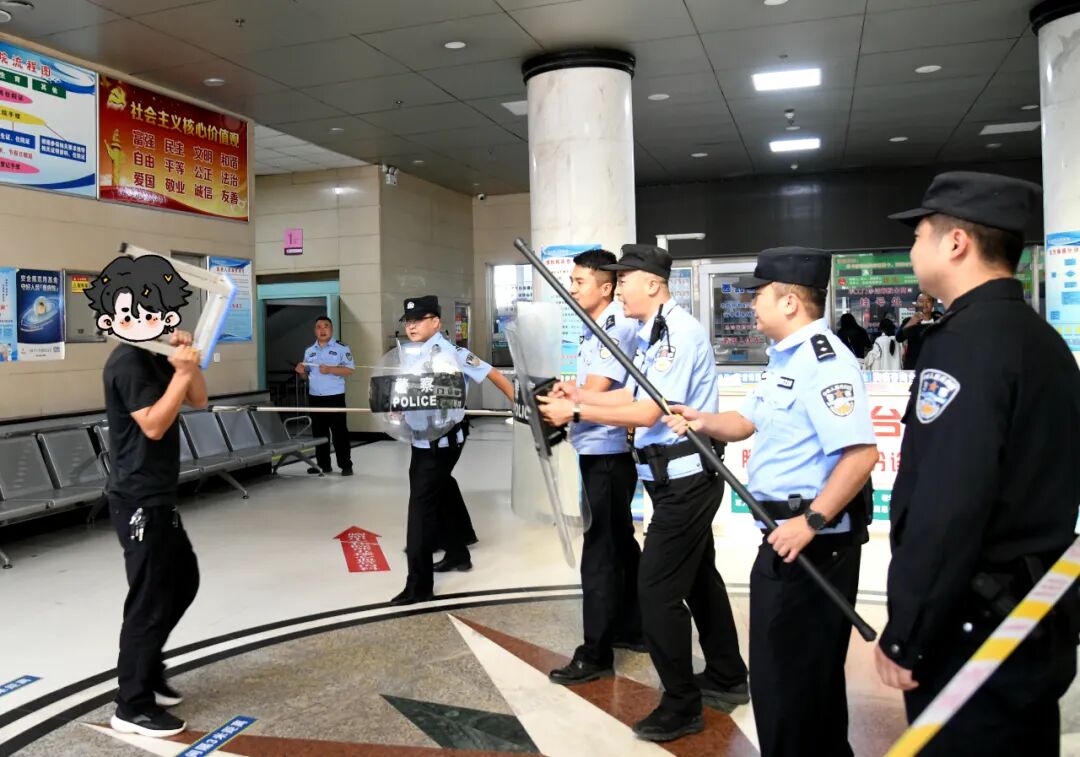 保安派出所警务站3名民警携带防暴盾牌、执法记录仪等装备迅速赶到门诊大厅。现场指挥民警与医院安保人员协同设立隔离区域,确保现场秩序可控。警务站民警分左右两侧以45度角协同推进,利用防暴盾牌构筑防护屏障,迅速控制醉酒人员并将其带离至警务站。