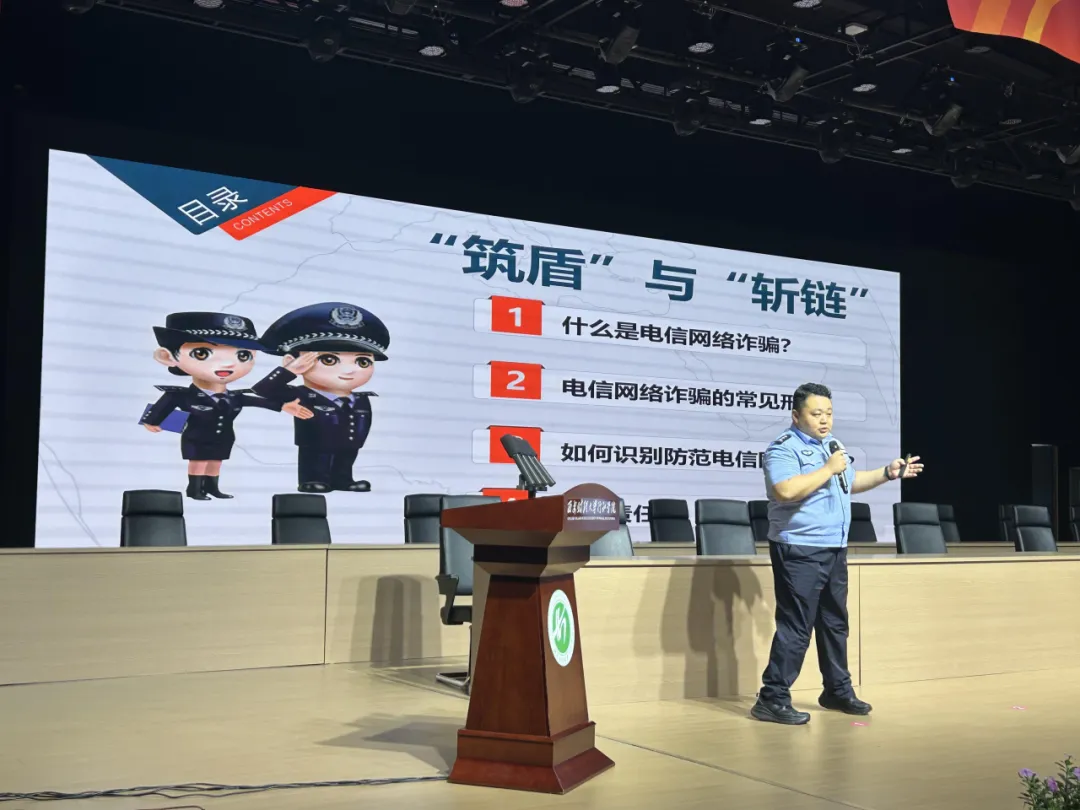 消防队员现场讲解火灾扑救与逃生技能,指导师生掌握灭火器使用步骤,进行模拟火情演练,切实提升应急自救能力。反诈民警杜常鑫结合高发电信诈骗案例,剖析刷单返利、冒充客服、校园贷等诈骗手法,发放反诈宣传单,鼓励师生与家人共同学习,筑牢防骗意识。民警张沛森聚焦网络安全,普及个人信息保护、防范网络谣言和抵制不良信息等重要内容,倡导依法上网、文明上网。禁毒民警屈艳婷通过案例展示与互动问答,介绍新型毒品的伪装形式与防范措施,教育学生远离毒品、珍爱生命。