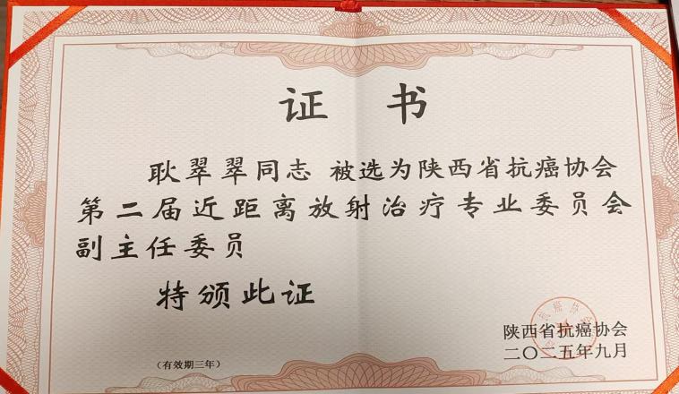 9月13日,陕西省抗癌协会近距离放射治疗专业委员会第五届学术大会在西安召开。大会汇聚国内肿瘤近距离治疗领域权威专家,共同探索宫颈癌最新研究以及靶区勾画,提升全国宫颈癌精准治疗水平。陕中二附院肿瘤一科耿翠翠副主任医师、刘宝刚主治医师分别当选陕西省抗癌协会近距离放射治疗专业委员会副主委、常务委员,放疗科副主任梁格格,肿瘤一科李磊强主治医生,物理师李欣、张禄,技师杨超当选委员。