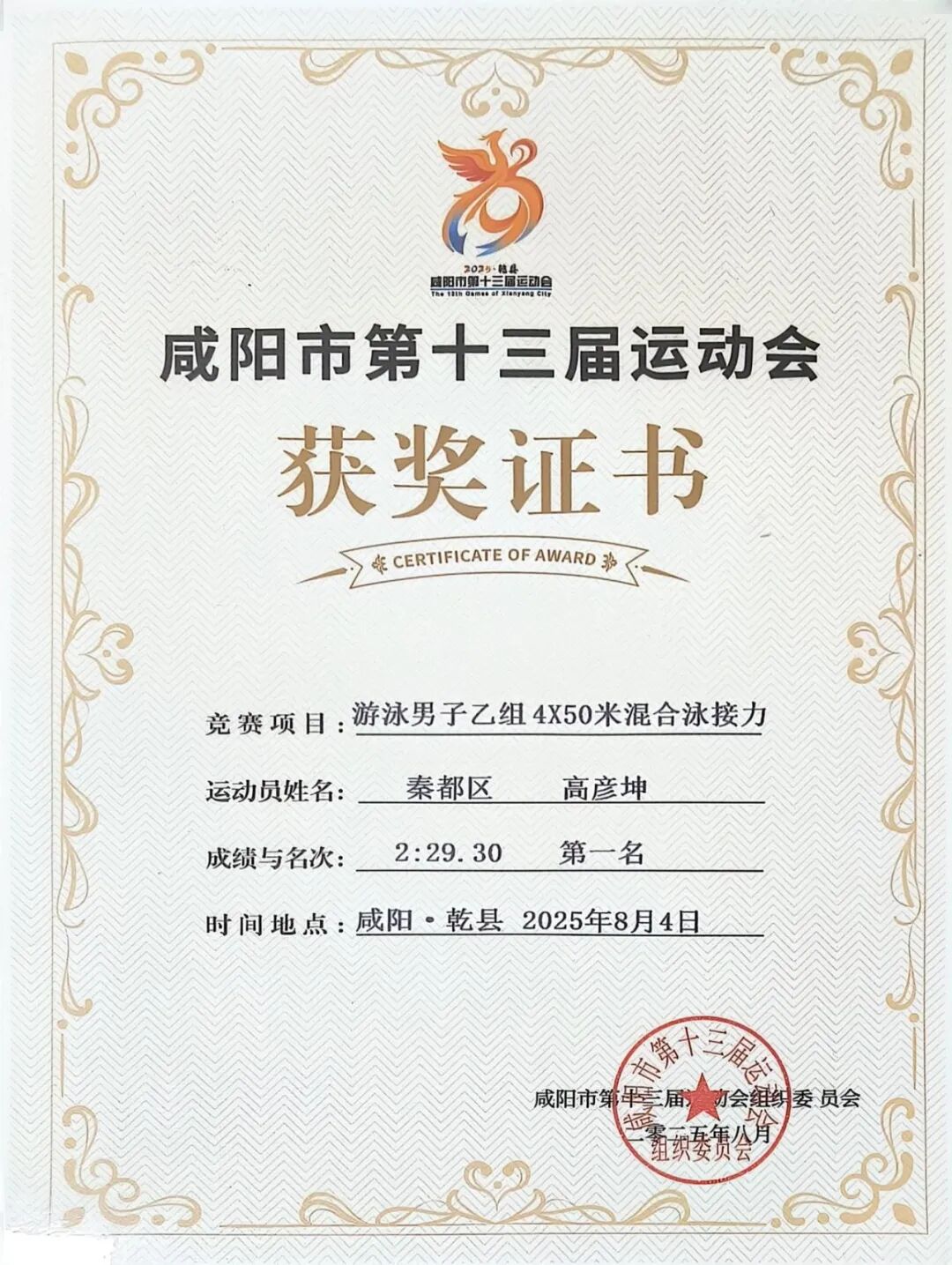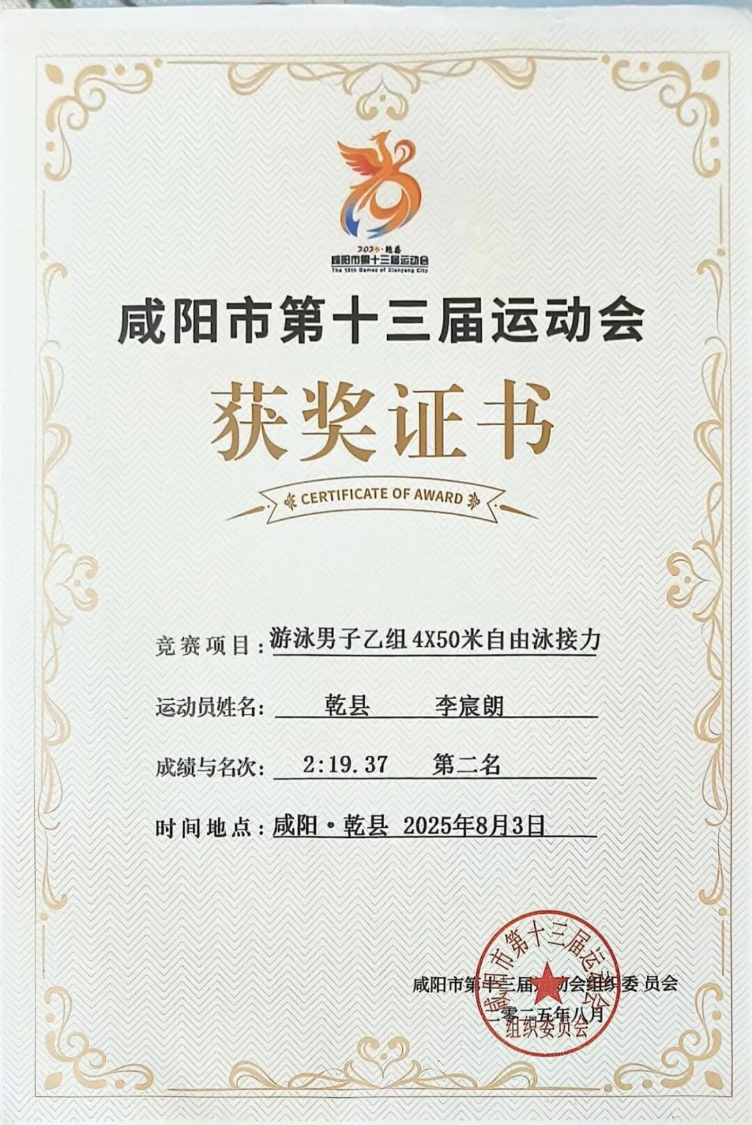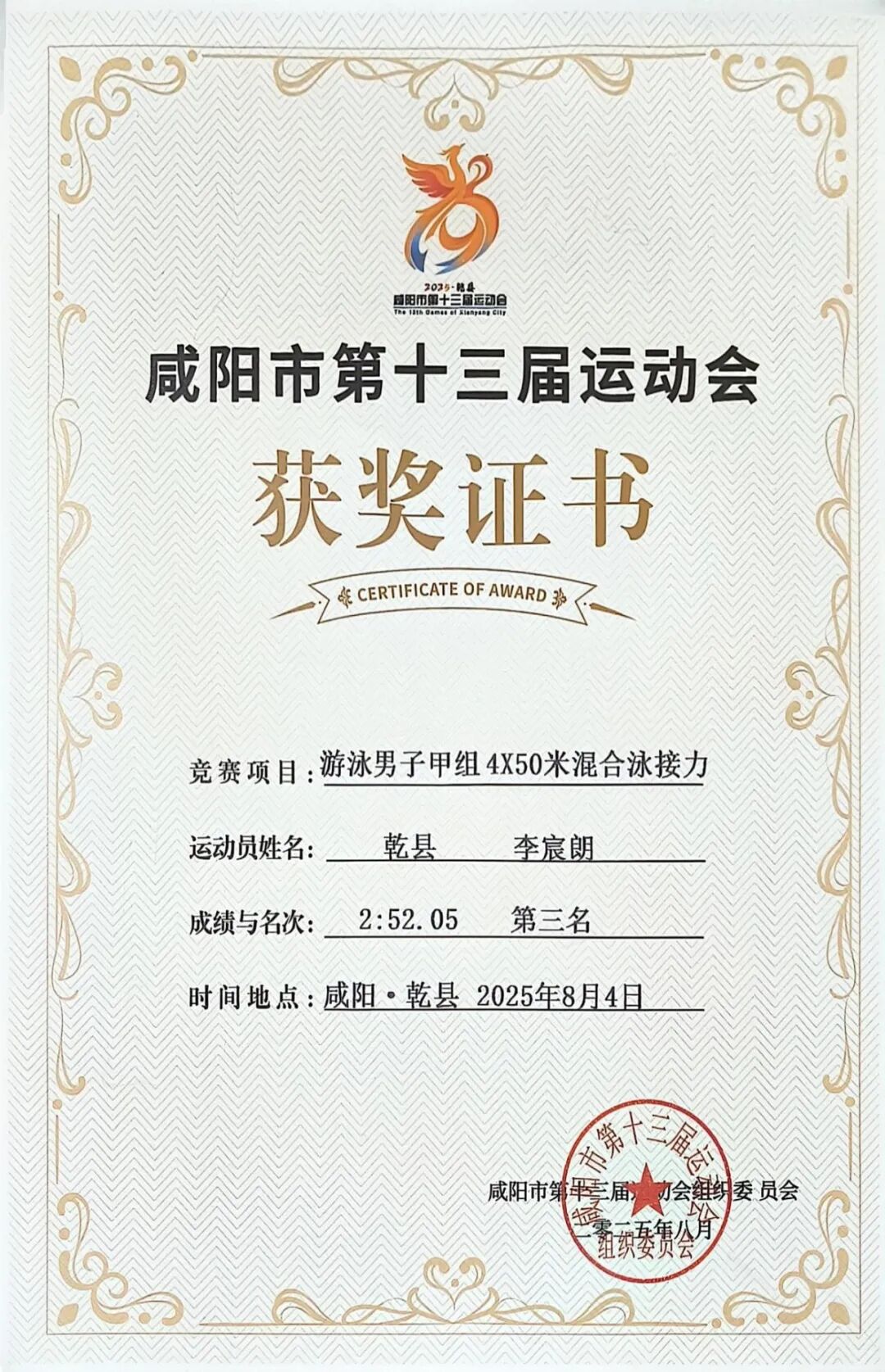 李宸朗同学在本次游泳比赛中同样表现出色,尤其在接力项目中展现出极强的团队责任感与竞技实力。在男子乙组4×50米自由泳接力赛中,李宸朗同学与队友紧密协作荣获第二名;随后,在男子甲组4×50米混合泳接力赛中,他与队友携手共进,成功拿下第三名。