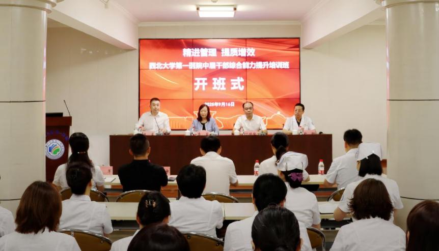 阳光讯(记者 郑亚雷)9月16日,西北大学第一医院举办2025年中层干部综合能力提升培训班开班仪式。本次培训以“精进管理,提质增效”为主题,旨在全面提升中层干部的综合素养与管理能力。西北大学副校长曹蓉、继续教育学院党支部(直属)书记叶培哲、医院班子成员及中层干部等130余人参加活动。医院党委书记陈晨主持开班仪式。首期讲座特邀中国工程院院士、第四军医大学原校长樊代明教授主讲。