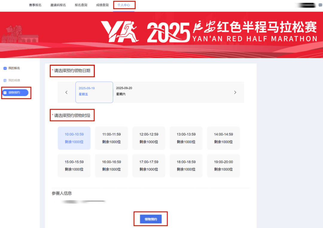 2.使用报名账号(手机号/邮箱)登录官网,依次点击“个人中心——领物预约”,依次选择“领物日期”、“领物时段”,完成选择并核对参赛人信息后,点击“领物预约”按钮。