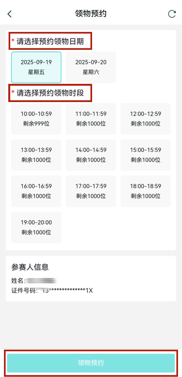 3.依次选择“领物日期”、“领物时段”,完成选择并核对参赛人信息后,点击“领物预约——确认”按钮。