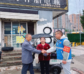 网格员主动帮助老人一起推车抵达维修点。随后,主动与维修师傅沟通,协调优先为老人检修车辆。短短20分钟,漏气的轮胎便修补完毕。直到看着老人骑着修好的车安心离去,网格员才转身继续投入到巡查工作中。