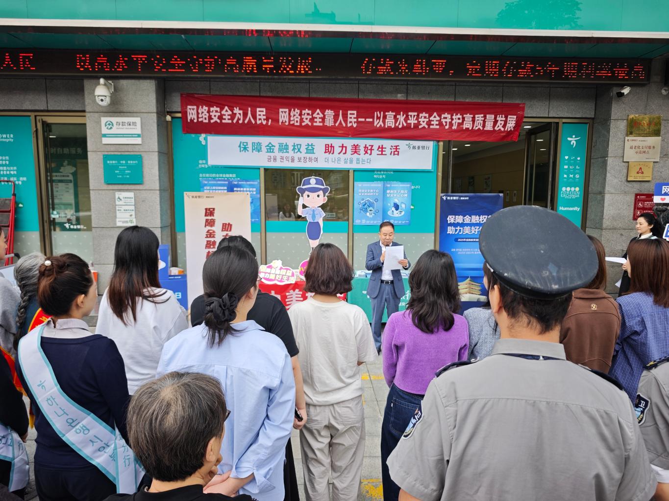 活动现场人头攒动,洋溢着浓厚的学习氛围。活动开始前,工作人员提前在银行大厅外悬挂横幅、张贴海报、摆放展板,并设立宣传咨询区,吸引了众多银行客户和过往市民驻足观看,了解咨询。上午10许,活动正式拉开帷幕。在主持人介绍活动背景和开展意义后,韩亚银行西安分行行长助理分享了该行在网络安全宣传方面的特色和亮点。同时,网络宣传志愿者宣读了倡议书,倡导大家积极行动起来,携手共筑网络安全防线。