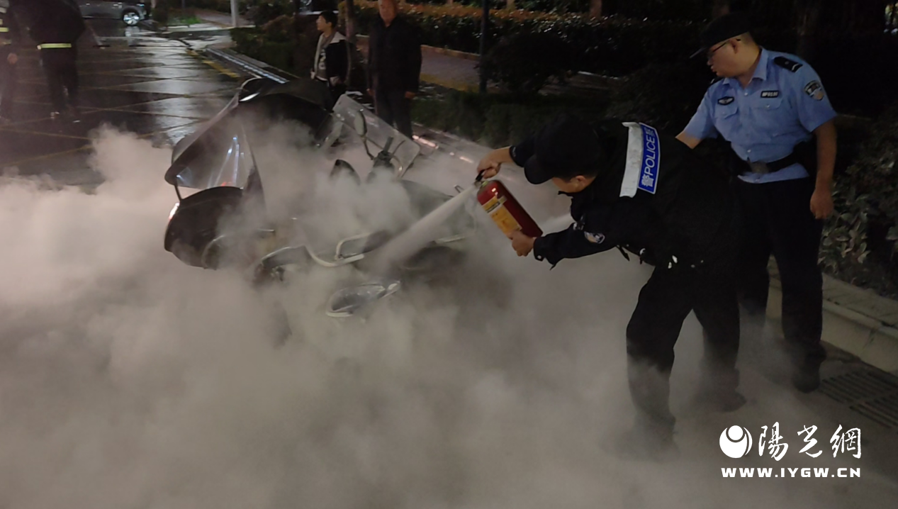 当日,一名学生家长神色慌张地冲到民警面前求助,称其停在路边的电动车底座冒烟,可能着火。民警立即赶赴现场,发现电动车底座浓烟滚滚,火苗蹿出,火势呈扩大趋势。当时正值放学高峰,人流、车流密集,电动车周围聚集大量家长和学生,情况危急。民警迅速取出警戒带和灭火器,一边疏散群众、设置警戒区域,一边用干粉灭火器扑救。经过近十分钟努力,明火被扑灭,无人员伤亡。经初步判断,起火原因系电瓶线路老化、受潮短路。车主和周边群众对民警的快速处置连连称赞。