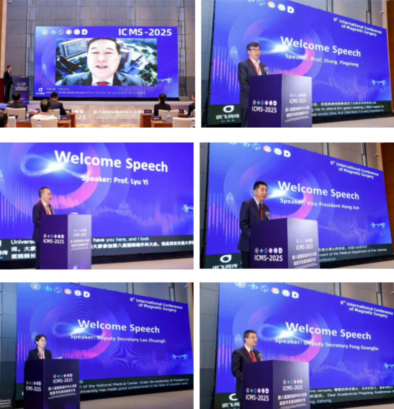 大会主席、中国工程院院士董家鸿通过线上方式致辞。他指出,磁外科不仅是一项技术突破,更是对现代外科理念的一次深刻重塑,并高度赞扬了吕毅教授团队的坚守与执着。大会主席、西安交通大学第一附属医院吕毅教授致辞,他向长期支持磁外科发展的各位同仁表示感谢,并希望通过大家的共同努力,为全球医学发展贡献更多的“中国智慧”和“中国方案”。西安交通大学党委副校长洪军致辞,他表示,磁外科是学校传承“西迁精神”、深化医工交叉的典范,展现了广阔的应用前景与强大的创新活力。陕西省委科技工委副书记兰壮丽致辞,她强调,省科技厅会一如既往大力支持交大一附院建设国家医学中心以及磁外科的发展。西安交通大学第一附属医院党委副书记冯广林致辞,他介绍了医院作为国家医学中心创建单位,在磁外科领域积极布局,并获得了国际同行的高度肯定。中国工程院院士张平祥致辞,他赞誉磁外科是医工交叉合作结出的硕果,并对中国原创技术引领世界前沿感到自豪,鼓励与会同仁继续深化合作,共同推动磁外科事业迈向新的高峰。