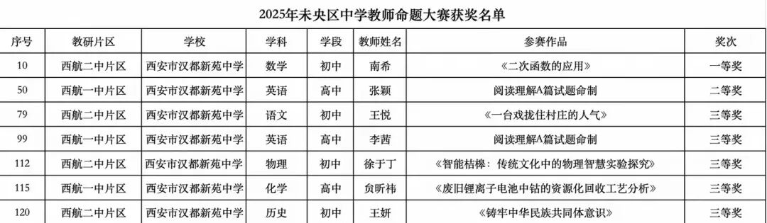 逐梦教育路,耕耘结硕果。西航二中教育集团汉都新苑中学教师积极参与2025年西安市未央区中学教师命题大赛,获奖名单如下: