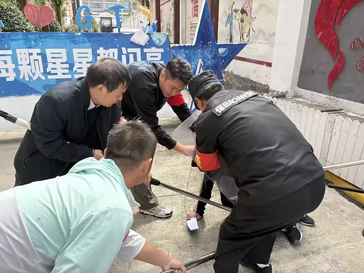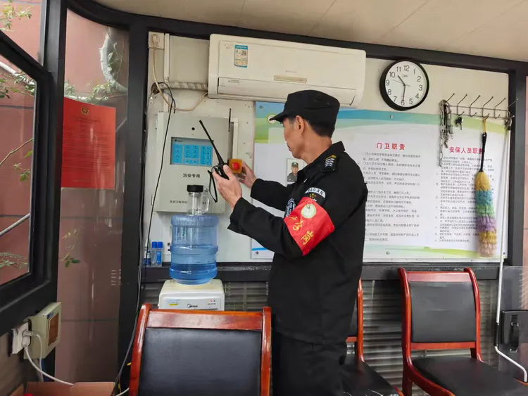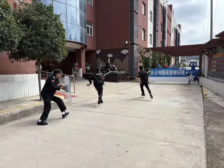 下午,演练正式启动。一名由学校老师扮演的“歹徒”持仿真器械试图强行闯入校园,校门口安保人员立即启动应急响应,迅速关闭大门,手持防暴器械组成防线阻拦;并第一时间按下紧急报警按钮,向学校应急指挥部报告情况。指挥部即刻研判,下达启动应急预案、组织避险及小分队处置的指令。
