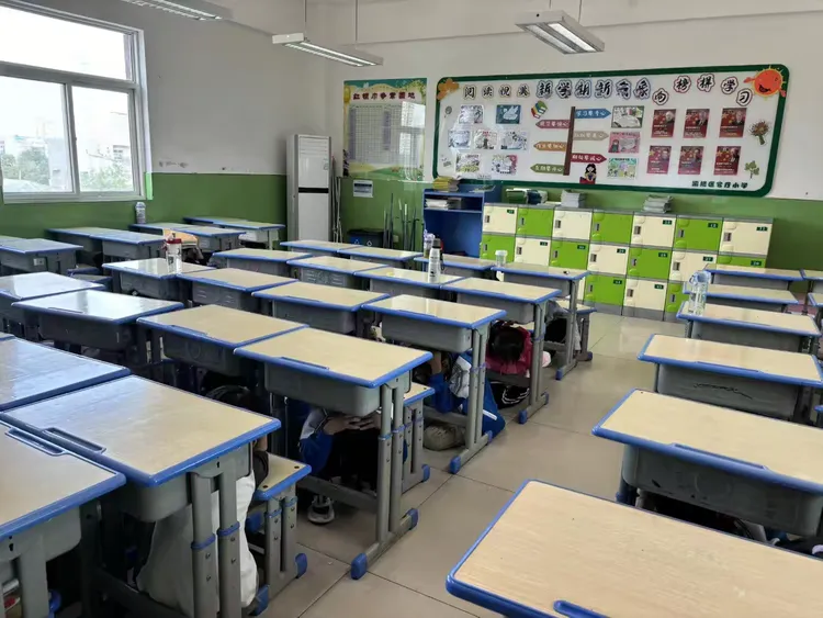 教室内,班主任迅速关窗锁门,指挥学生躲至桌下护头;操场上,体育老师则带领学生撤离至安全区域并清点报备。