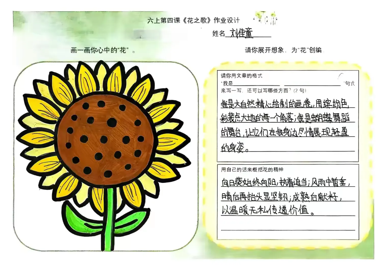 在《花之歌》一课中,老师引导学生通过绘画与文字结合的方式,表达花的精神与象征意义。学生用手中的画笔描绘出心中最美的花,并用诗意的语言诠释花的品格。