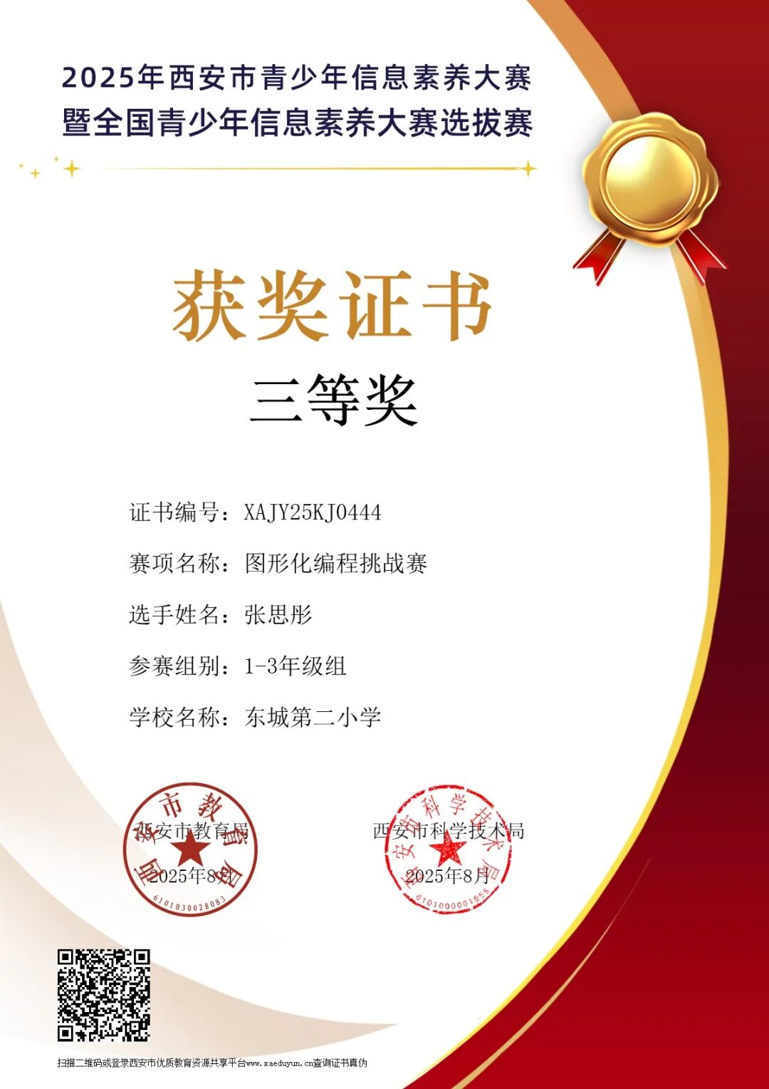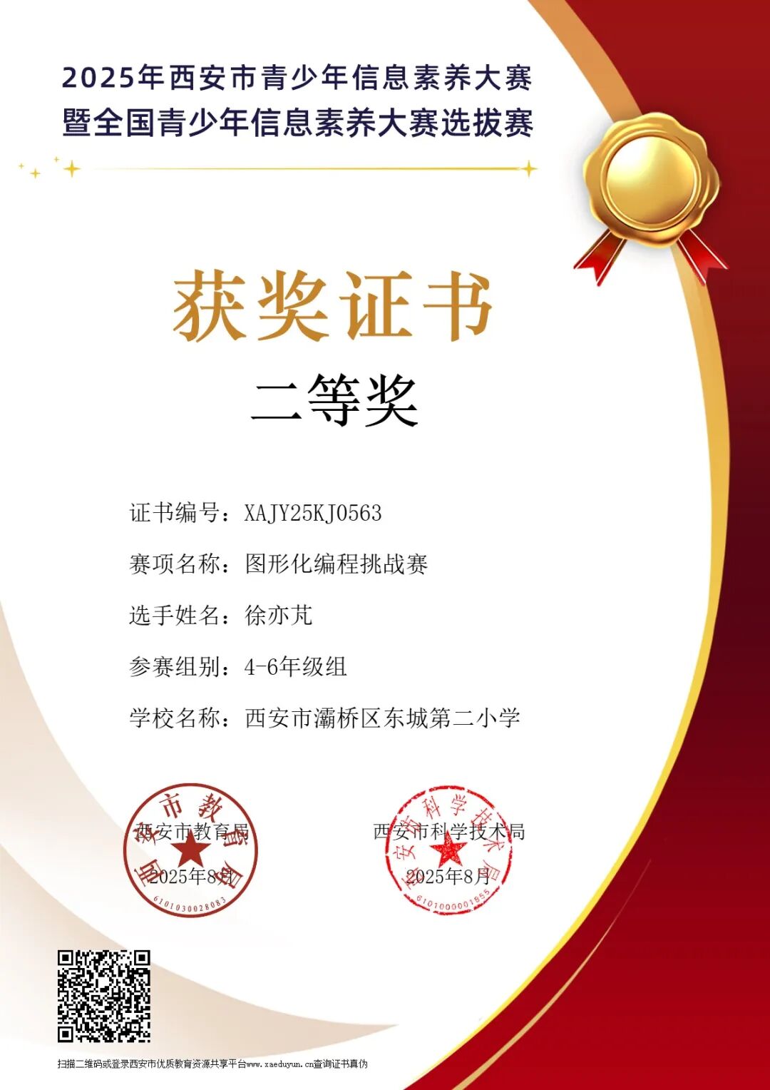当科技热情遇上不懈坚持,便会绽放出耀眼的荣誉之花!在不久前圆满落幕的2025年西安市青少年信息素养大赛暨全国青少年信息素养大赛市级选拔赛上,西安市灞桥区东城第二小学学子与来自全市的优秀选手同台竞技,凭借扎实的功底、创新的思维和出色的临场表现,取得了优异成绩!