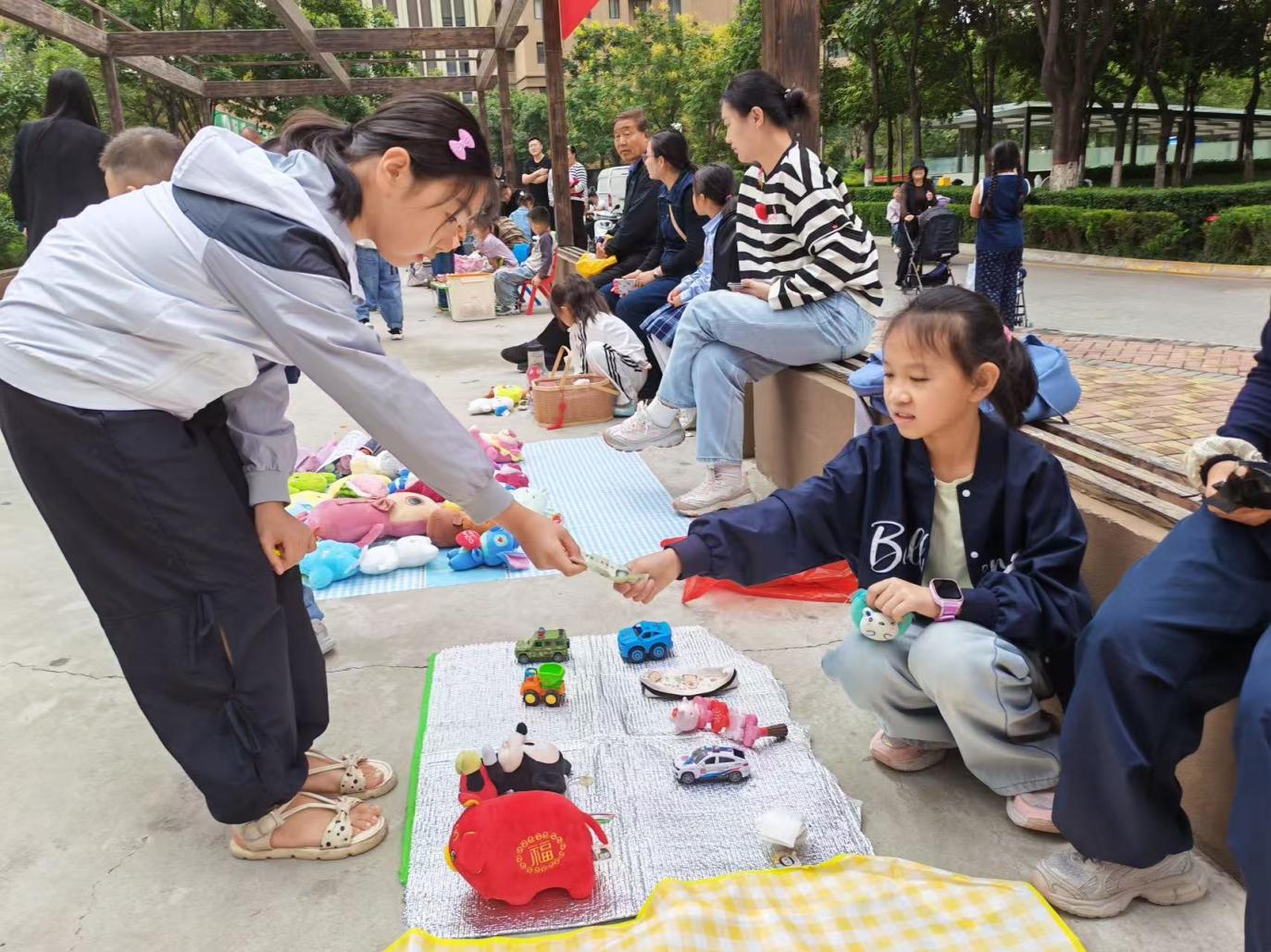 活动现场,地垫铺就的“迷你商铺”依次排开,玩具、绘本、手工饰品等闲置物品被孩子们精心陈列。萌娃“掌柜”们热情吆喝,有的演示玩具玩法,有的尝试“以物换物”,“这个拼图3元卖给你,很划算哦!”童声吆喝引居民驻足。家长们在旁暖心陪伴,或协助整理摊位,或引导礼貌沟通,现场欢笑声不断。