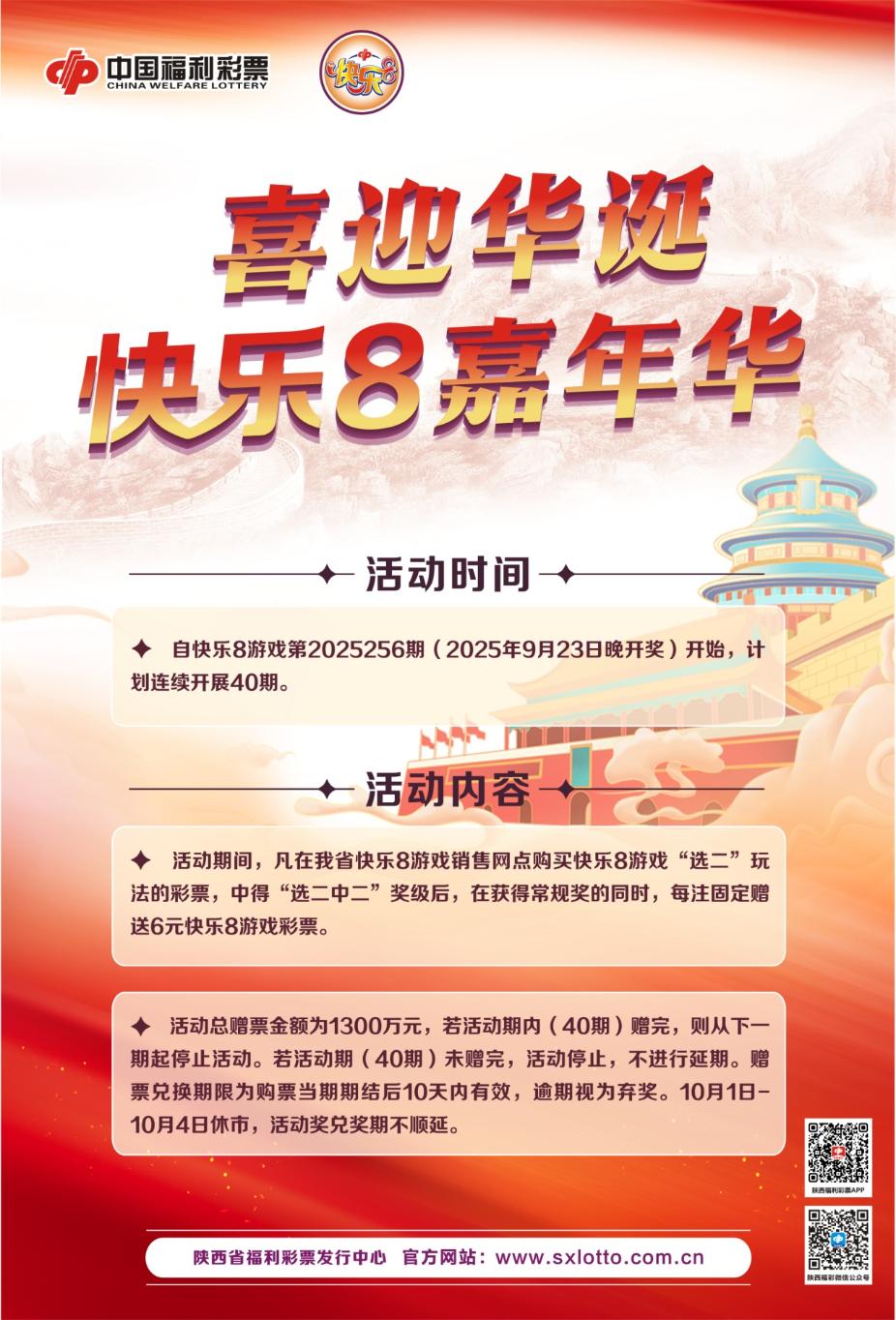 为庆祝国庆佳节,回馈购彩者长期以来的支持与厚爱,进一步扩大快乐8游戏品牌知名度,自9月23日起,陕西福彩正式启动“喜迎华诞 快乐8嘉年华”赠票回馈活动,总赠票金额达1300万元,再度为购彩者送上金秋福利。