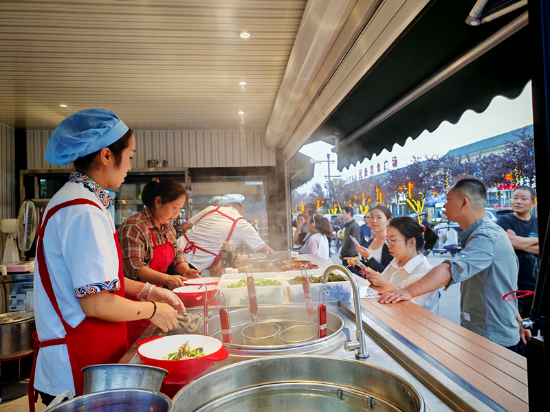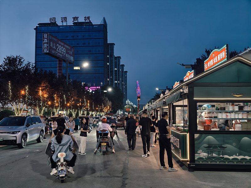 据了解,该项目于今年8月中旬开工建设,历时1个月,对长约334米,宽约16米,总用地面积约 5344 平方米的秦景南路夜市进行了提升改造,改造门头牌匾1个,架设路灯8盏,制作美陈6个,敷设电缆和污水管网300米,搭建雨棚60个,购置餐车60辆,同时,还改建文化活动展演舞台1座,不断完善夜市基础设施建设,吸引市民和游客前来。